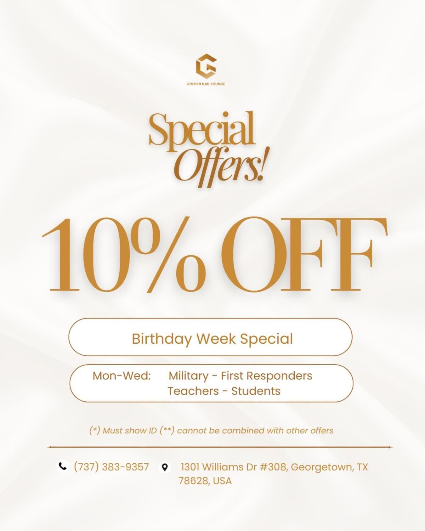 Enjoy 10% OFF all services during our Birthday Week Special at Golden Nail Lounge. Treat yourself to a relaxing manicure, pedicure, or your favorite nail set at a special price!